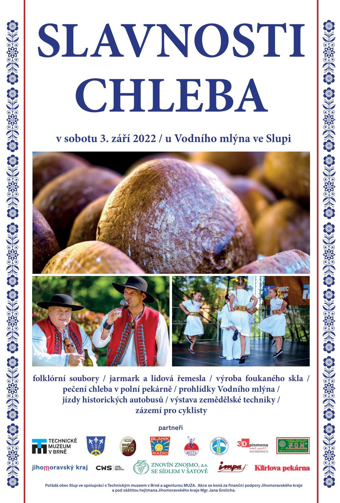 V sobotu 3. září 2022 se v areálu Vodního mlýna ve Slupi koná další ročník Slavností chleba. Návštěvníci se mohou opět těšit na čerstvě upečený chleba, výstavu zemědělské techniky, řemeslný jarmark a v neposlední řadě na přehlídku folklorních souborů. Tradičně budou mít návštěvníci slavností možnost prohlédnout si celý vodní mlýn za jednotné zlevněné vstupné ve výši 30 Kč. Mlýn bude otevřený od 9.00 do 18.00.